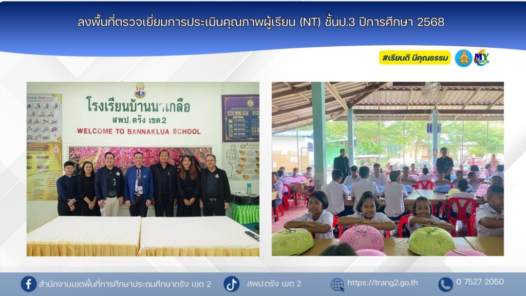 เมื่อวันที่ 25 กุมภาพันธ์ 2569 นางสาวปัญจศีล ภูสงัด ผอ.สพป.ตรัง เขต 2 ได้มอบหมายให้นายภูวดล เม่งช่วย รอง ผอ.สพป.ตรัง เขต 2 นายนิวัติ สุขไชยะ ผอ.กลุ่มบริหารงานการเงินและสินทรัพย์ และนายอาฒยะ บัวเพชร ศึกษานิเทศก์ สพป.ตรัง เขต 2 ตรวจเยี่ยมสนามสอบ NT ประจำปีการศึกษา 2568 ณ สนามสอบโรงเรียนบ้านนาเกลือ เพื่อกำกับติดตามการดำเนินการสอบ NT ให้เป็นไปตามมาตรฐาน พร้อมทั้งให้คำแนะนำการบริหารจัดการอาหารกลางวัน และภาพรวมการดำเนินงานของสถานศึกษา