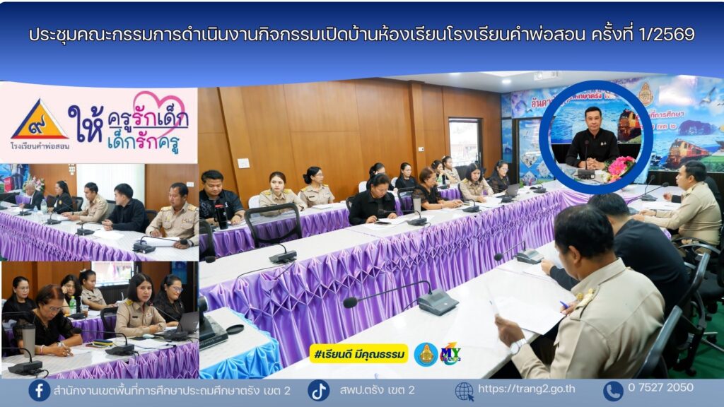 เมื่อวันที่ 2 มีนาคม 2569 นางสาวปัญจศีล ภูสงัด ผอ.สพป.ตรัง เขต 2 มอบหมายให้นายภูวดล เม่งช่วย รอง ผอ.สพป.ตรัง เขต 2 เป็นประธานการประชุมคณะกรรมการดำเนินงานกิจกรรมเปิดบ้านห้องเรียนโรงเรียนคำพ่อสอน ครั้งที่ 1/2569 ณ ห้องประชุมอันดามัน 4 สพป.ตรัง เขต 2 เพื่อเตรียมความพร้อมกิจกรรมเปิด บ้านห้องเรียนโรงเรียนคำพ่อสอน ในวันที่ 10 มีนาคม 2569 ณ อาคารเรียน 9 โรงเรียนห้วยยอด (กลึงวิทยาคาร) อำเภอห้วยยอด จังหวัดตรัง โดยมีพลเอกบุญสิน พาดกลาง นายทหารราชองครักษ์และที่ปรึกษา ผู้บัญชาการทหารบก เดินทางมาบรรยายพิเศษ หัวข้อ กิจกรรมส่งเสริมความรักชาติ ศาสน์ กษัตริย์ และกิจกรรมเสวนาโรงเรียนคำพ่อสอนลงสู่นักเรียน พร้อมแบ่งกลุ่มทำ Workshop
