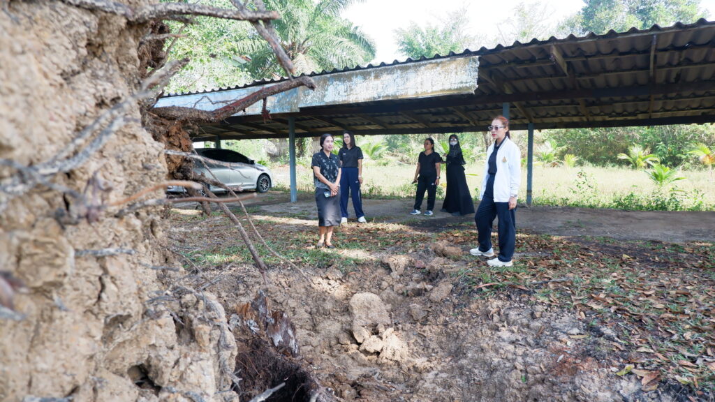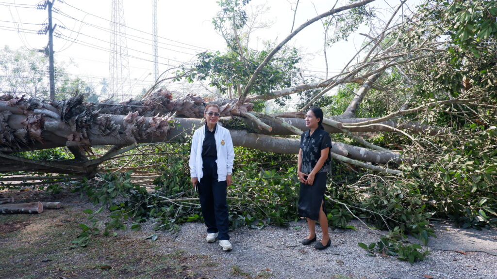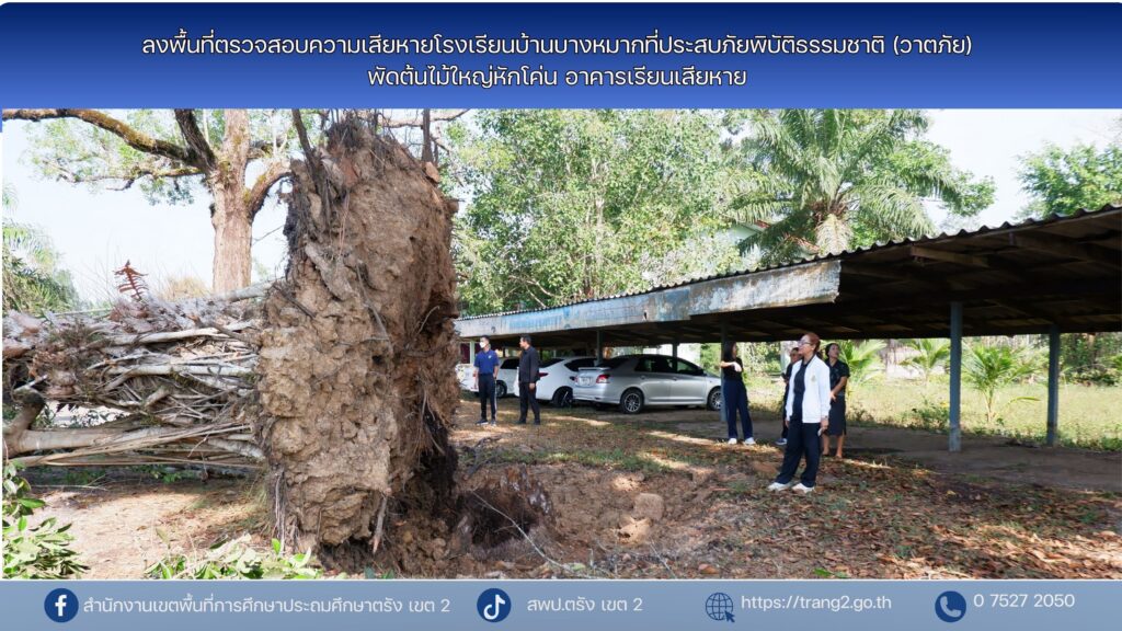 วันที่ 25 กุมภาพันธ์ 2569 นางสาวปัญจศีล ภูสงัด ผอ. สพป.ตรัง เขต 2 พร้อมด้วยนางเรณู ชูสังข์ ผอ.กลุ่มนโยบายและแผน สพป.ตรัง เขต 2 ได้ลงพื้นที่โรงเรียนบ้านบางหมาก อำเภอกันตัง จังหวัดตรัง เพื่อตรวจสอบความเสียหายจากภัยพิบัติธรรมชาติ (วาตภัย) เนื่องจากเมื่อวันที่ 24 กุมภาพันธ์ 2569 เวลาประมาณ 17.00 น. ได้เกิดพายุฝน ลมพัดแรง เป็นเหตุให้ต้นไม้ใหญ่อายุกว่า 100 ปี หักโค่น จำนวน 1 ต้น อาคารเรียน อาคารประกอบ จำนวน 3 หลัง ได้รับความเสียหายในส่วนของกระเบื้องหลังคา และฝ้าเพดาน แต่ไม่มีนักเรียนและบุคลากรในโรงเรียนได้รับบาดเจ็บเนื่องจากเหตุเกิดขึ้นหลังเลิกเรียน เบื้องต้นได้ให้โรงเรียนดำเนินการตัดแต่งกิ่งไม้ ต้นไม้รอบ ๆ โรงเรียน และซ่อมแซมหลังคาไม่ให้เกิดอันตรายและความชำรุดต่อเนื่อง โดยหลังจากนี้ให้เร่งดำเนินการจัดทำรายการประมาณราคาค่าปรับปรุงซ่อมแซมเสนอคำของบประมาณต่อ สพป.ตรัง เขต 2