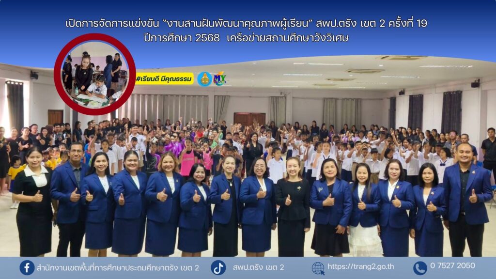 เมื่อวันที่ 18 กุมภาพันธ์ 2569 นางสาวปัญจศีล ภูสงัด ผอ.สพป.ตรัง เขต 2 ได้มอบหมายให้นางสาวสุภานี บวรศุภศรี รองผอ.สพป.ตรัง เขต 2 เป็นประธานในพิธีเปิดการจัดการแข่งขัน “งานสานฝันพัฒนาคุณภาพผู้เรียน” สพป.ตรัง เขต 2 ครั้งที่ 19 ปีการศึกษา 2568 เครือข่ายสถานศึกษาวังวิเศษ ณ โรงเรียนบ้านต้นปรง อำเภอวังวิเศษ จังหวัดตรัง