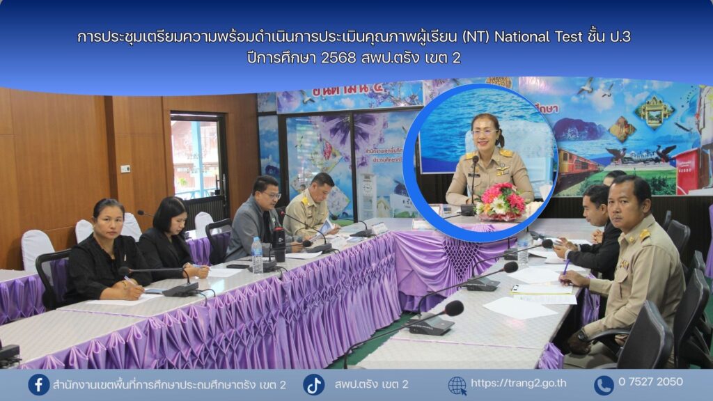 วันที่ 23 กุมภาพันธ์ 2569 นางสาวปัญจศีล ภูสงัด ผอ. สพป.ตรัง เขต 2 เป็นประธานการประชุมเตรียมความพร้อมดำเนินการประเมินคุณภาพผู้เรียน (NT) National Test ชั้นประถมศึกษาปีที่ 3 ปีการศึกษา 2568 สพป.ตรัง เขต 2 โดยมีนายภูวดล เม่งช่วย รองผอ.สพป.ตรัง เขต 2 ผอ.กลุ่มนิเทศ ติดตามและประเมนผล ศึกษานิเทศก์ สพป.ตรัง เขต 2 ร่วมประชุม ณ ห้องประชุมอันดามัน 4 สพป.ตรัง เขต 2 ในการนี้ประธานสนามสอบ และคณะกรรมการกลาง ได้ร่วมประชุมผ่านระบบ Zoom Meeting