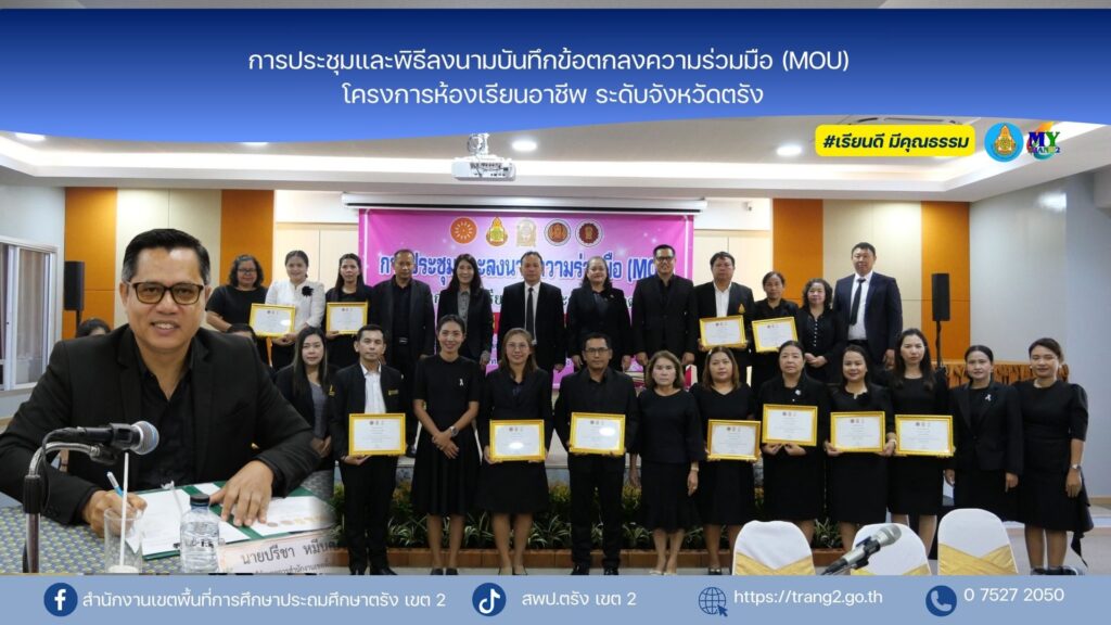 วันที่ 23 ธันวาคม 2568 นางสุริยา เครือรัตน์ ผอ.สพป.ตรัง เขต 2 ได้มอบหมายให้นายปรีชา หมีนคลาน รอง ผอ.สพป.ตรัง เขต 2 เข้าร่วมการประชุมและพิธีลงนามบันทึกข้อตกลงความร่วมมือ (MOU) โครงการห้องเรียนอาชีพ ระดับจังหวัดตรัง โดยมีนายจรูญ ชูสังข์ ผู้อำนวยการวิทยาลัยสารพัดช่างตรัง พร้อมด้วยคณะผู้บริหารการศึกษา ผู้บริหารสถานศึกษา คณะครู และบุคลากร สถานศึกษาในจังหวัดตรังเข้าร่วมโครงการจำนวน 43 โรงเรียน