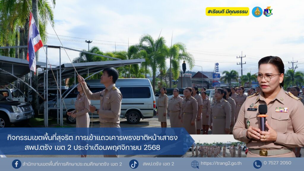 เมื่อวันที่ 3 พฤศจิกายน 2568 นางสุริยา เครือรัตน์ ผอ.สพป.ตรัง เขต 2 นางอัมพิกา อักษรสว่าง รอง ผอ.สพป.ตรัง เขต 2 พร้อมคณะบุคลากรดำเนินกิจกรรมเขตพื้นที่สุจริตด้วยการเข้าแถวเคารพธงชาติ ,   สวดมนต์ไหว้พระและการกล่าวคำปฏิญญาเขตพื้นที่การศึกษาสุจริต เพื่อทำพิธีเคารพธงชาติในช่วงเช้า ซึ่งเป็นส่วนหนึ่งของการปลูกฝังความรักชาติ ศาสนา พระมหากษัตริย์ และระเบียบวินัย ตลอดถึงเป็นการเสริมสร้างวัฒนธรรม ทัศนคติและค่านิยมในการปฏิบัติงานด้วยความซื่อสัตย์สุจริต ของ สพป.ตรัง เขต 2 และการต่อต้านการทุจริตทุกรูปแบบ ด้วยการขับเคลื่อนโครงการเสริมสร้างคุณธรรม จริยธรรมและ ธรรมาภิบาล ในเขตพื้นที่การศึกษา ตลอดถึงการแจ้งข้อราชการสำคัญ เพื่อขับเคลื่อนการดำเนินงานภายในสำนักงาน