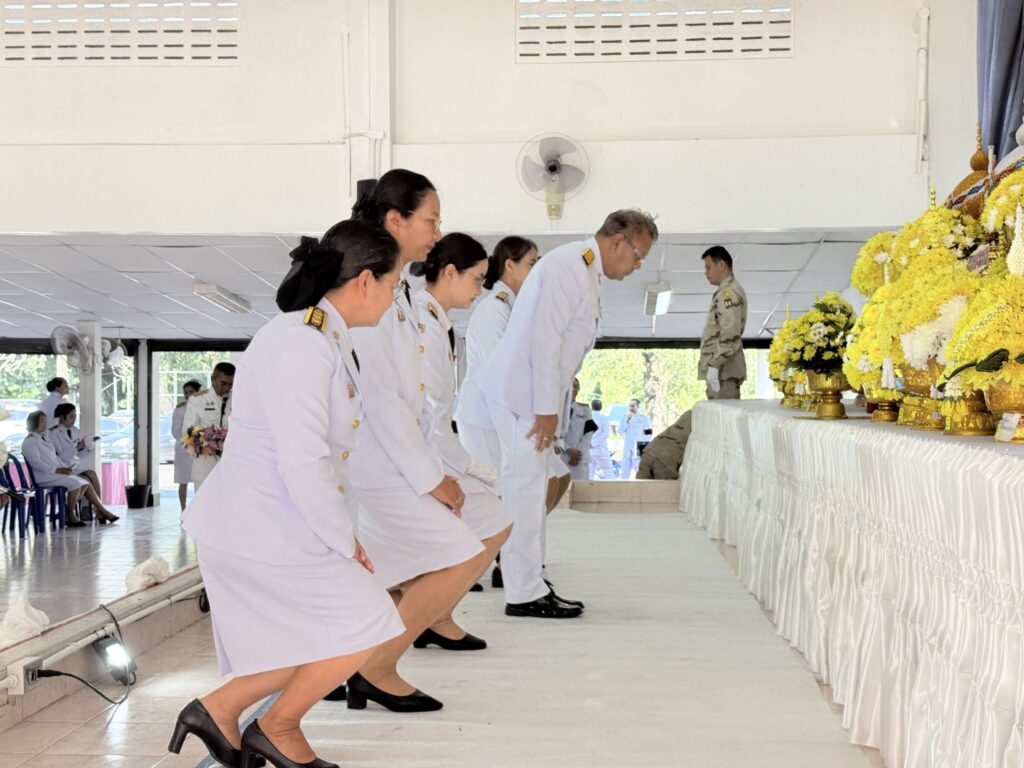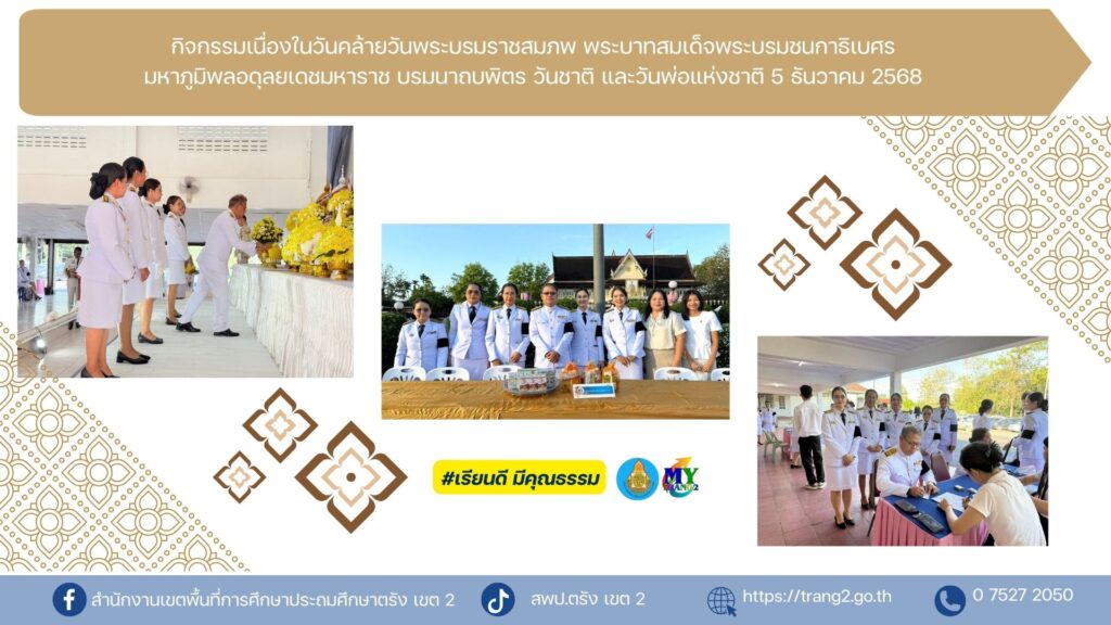 วันที่ 5 ธันวาคม 2568 นางสุริยา เครือรัตน์ ผอ.สพป.ตรัง เขต 2 ได้มอบหมายให้นายนิวัติ สุขไชยยะ ผอ.กลุ่มบริหารการเงินและสินทรัพย์ นางสาวนภสร อิล่อง ผอ.หน่วยตรวจสอบภายใน และบุคลากร สพป.ตรัง เขต 2 เข้าร่วมกิจกรรมเนื่องในวันคล้ายวันพระบรมราชสมภพ พระบาทสมเด็จพระบรมชนกาธิเบศรมหาภูมิพลอดุลยเดชมหาราช บรมนาถบพิตร วันชาติ และวันพ่อแห่งชาติ 5 ธันวาคม 2568 ประกอบด้วย เวลา 07.00 น.พิธีเจริญพระพุทธมนต์และทำบุญตักบาตรถวายพระราชกุศล ณ บริเวณลานอเนกประสงค์เทศบาลตำบลห้วยยอด อำเภอห้วยยอด จังหวัดตรัง และเวลา 08.30 น. พิธีวางพานพุ่มดอกไม้ถวายบังคมเบื้องหน้าพระบรมฉายาลักษณ์พระบาทสมเด็จพระบรมชนกาธิเบศร มหาภูมิพล อดุลยเดชมหาราช บรมนาถบพิตร ณ ศาลาประชาคมอำเภอห้วยยอด โดยมี นายณัฐวุฒิ สังข์สุข นายอำเภอห้วยยอด เป็นประธานในพิธี