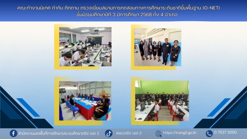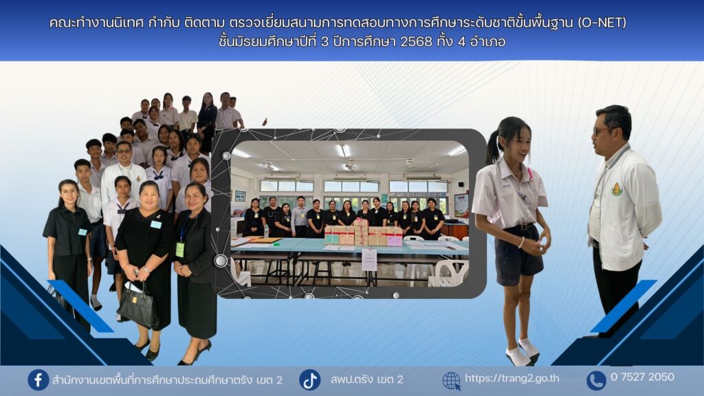 วันที่ 1 กุมภาพันธ์ 2569 นางสาวปัญจศีล ภูสงัด ผอ.สพป.ตรัง เขต 2 ได้มอบหมายให้คณะทำงานนิเทศ กำกับ ติดตาม ตรวจเยี่ยมสนามการทดสอบทางการศึกษาระดับชาติขั้นพื้นฐาน (O-NET) ชั้นมัธยมศึกษาปีที่ 3 ปีการศึกษา 2568 ทั้ง 4 อำเภอ ประกอบด้วย อำเภอห้วยยอด อำเภอสิเกา อำเภอวังวิเศษ และอำเภอรัษฎา ลงพื้นที่ตรวจเยี่ยม และให้กำลังใจในการจัดการทดสอบที่สนามสอบโรงเรียนบ้านนาเมืองเพชร และโรงเรียนห้วยยอด (กลึงวิทยาคาร) โรงเรียนวัดควนเมา โรงเรียนบ้านแหลมมะขาม โรงเรียนบ้านหนองชุมแสง โรงเรียนวัดคีรีวิหาร