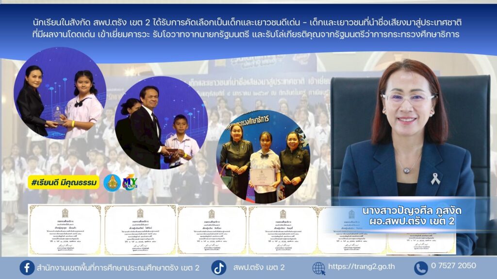 นักเรียนในสังกัด สพป.ตรัง เขต 2 ได้รับการคัดเลือกเป็นเด็กและเยาวชนดีเด่น – เด็กและเยาวชนที่นำชื่อเสียงมาสู่ประเทศชาติที่มีผลงานโดดเด่น เข้าเยี่ยมคารวะ รับโอวาทจากนายกรัฐมนตรี และรับโล่เกียรติคุณจากรัฐมนตรีว่าการกระทรวงศึกษาธิการ