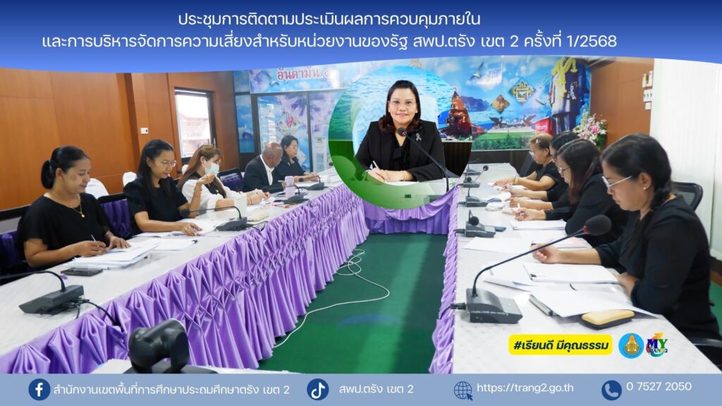 เมื่อวันที่ 25 ธันวาคม 2568 นางสุริยา เครือรัตน์ ผอ.สพป.ตรัง เขต 2 เป็นประธานประชุมการติดตามประเมินผลการควบคุมภายในและการบริหารจัดการความเสี่ยงสำหรับหน่วยงานของรัฐ สพป.ตรัง เขต 2 ครั้งที่ 1/2568 โดยมีนางอัมพิกา อักษรสว่าง รอง ผอ.สพป.ตรัง เขต 2 ผอ.กลุ่ม/หน่วย และบุคลากรที่เกี่ยวข้อง เข้าร่วม ณ ห้องประชุมอันดามัน 4 สพป.ตรัง เขต 2