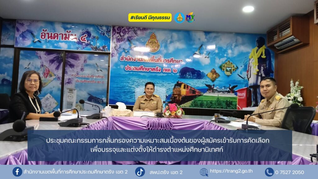 วันที่ 24 พฤศจิกายน 2568 นางสุริยา เครือรัตน์ ผอ.สพป.ตรัง เขต 2 เป็นประธานการประชุมคณะกรรมการกลั่นกรองความเหมาะสมเบื้องต้นของผู้สมัครเข้ารับการคัดเลือกเพื่อบรรจุและแต่งตั้งให้ดำรงตำแหน่งศึกษานิเทศก์ สังกัดสำนักงานคณะกรรมการการศึกษาขั้นพื้นฐาน สำนักงานเขตพื้นที่การศึกษาประถมศึกษาตรัง เขต 2 ณ ห้องประชุมอันดามัน 4 สพป.ตรัง เขต 2 ซึ่งมีผู้สมัคร จำนวน 1 ราย