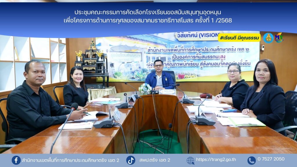 วันที่ 16 ธันวาคม 2568 นางสุริยา เครือรัตน์ ผอ.สพป.ตรัง เขต 2 ได้มอบหมายให้นายปรีชา หมีนคลาน รอง ผอ.สพป.ตรัง เขต 2 เป็นประธานการประชุมคณะกรรมการคัดเลือกโรงเรียนขอสนับสนุนทุนอุดหนุนเพื่อโครงการด้านการกุศลของสมาคมราชกรีฑาสโมสร ครั้งที่ 1 /2568 ณ ห้องประชุมอันดามัน 1 สพป.ตรัง เขต 2