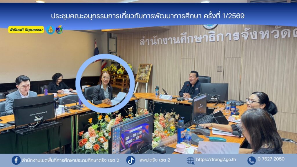 วันที่ 21 มกราคม 2569 นางสาวปัญจศีล ภูสงัด ผอ.สพป.ตรัง เขต 2 เข้าร่วมประชุมคณะอนุกรรมการเกี่ยวกับการพัฒนาการศึกษา ครั้งที่ 1/2569 ณ ห้องประชุมสำนักงานศึกษาธิการจังหวัดตรัง (ชั้น 2) อำเภอเมืองตรัง จังหวัดตรัง โดยมีนางสาวปิยะวรรณ มากหอม นักวิชาการศึกษาชำนาญการ สพป.ตรัง เขต 2 เข้าร่วมด้วย