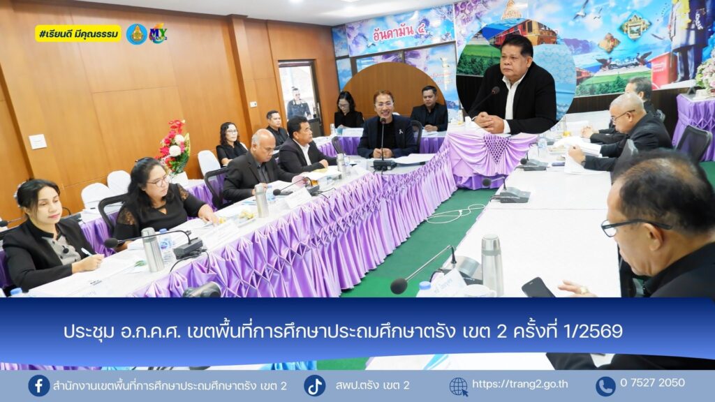 เมื่อวันที่ 22 มกราคม 2569 นางสาวปัญจศีล ภูสงัด ผอ.สพป.ตรัง เขต 2 ทำหน้าที่อนุกรรมการและเลขานุการ อ.ก.ค.ศ. เขตพื้นที่การศึกษาประถมศึกษาตรัง เขต 2 ในการประชุมคณะอนุกรรมการข้าราชการครูและบุคลากรทางการศึกษาเขตพื้นที่การศึกษาประถมศึกษาตรัง เขต 2 ครั้งที่ 1/2569 โดยมีนายภูวนัฐ สมใจ เป็นประธาน ณ ห้องประชุมอันดามัน 4 สพป.ตรัง เขต 2