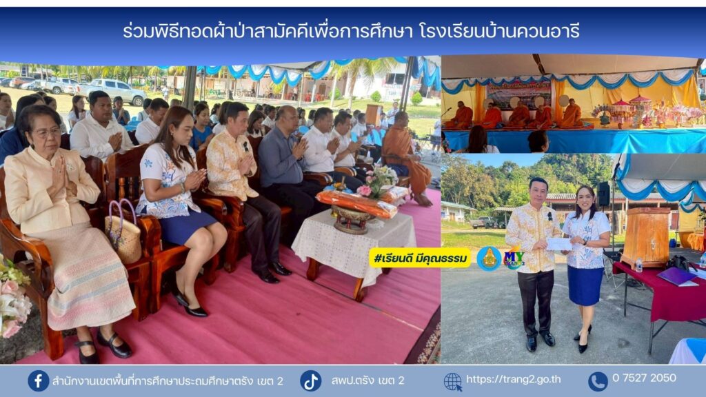 วันที่ 17 มกราคม 2569 นางสาวปัญจศีล ภูสงัด ผอ.สพป.ตรัง เขต 2 ได้มอบหมายให้นายภูวดล เม่งช่วย รองผอ.สพป.ตรัง เขต 2 ร่วมเป็นเกียรติในพิธีทอดผ้าป่าสามัคคีเพื่อการศึกษา โรงเรียนบ้านควนอารี โดยมีนายณัฐวุฒิ สังข์สุข นายอำเภอห้วยยอด เป็นประธานในพิธี ร่วมด้วยคณะกรรมการสถานศึกษา ผู้นำท้องถิ่น ผู้นำท้องที่ ผู้ปกครอง นักเรียน ณ โรงเรียนบ้านควนอารี ตำบลบางดี อำเภอห้วยยอด จังหวัดตรัง