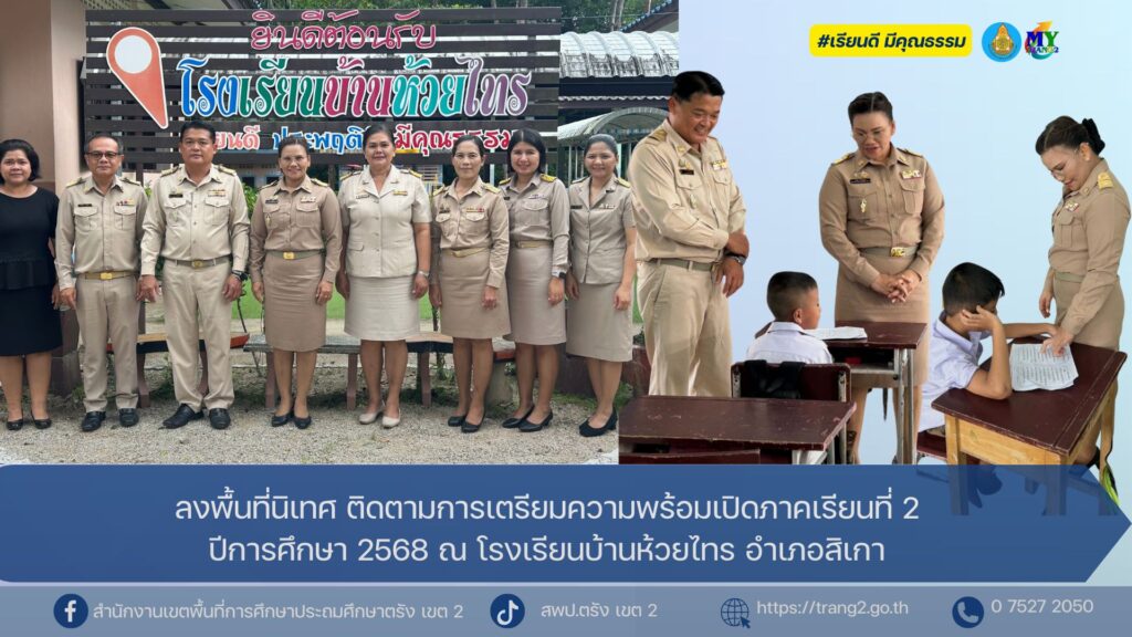 วันที่ 3 พฤศจิกายน 2568 นางสุริยา เครือรัตน์ ผอ.สพป.ตรัง เขต 2 พร้อมด้วยนายวิทยา ชูแก้ว นิติกรปฏิบัติการ ปฏิบัติหน้าที่ ผอ.กลุ่มกฎหมายและคดี นางสาวจันทรา  อ่อนหวาน ศึกษานิเทศก์ ลงพื้นที่นิเทศ ติดตามการเตรียมความพร้อมเปิดภาคเรียนที่ 2 ปีการศึกษา 2568 ณ โรงเรียนบ้านห้วยไทร อำเภอสิเกา จังหวัดตรัง โดยมีนายจรัส สีสายทอง ผอ.โรงเรียนบ้านห้วยไทร คณะครู ให้การต้อนรับ