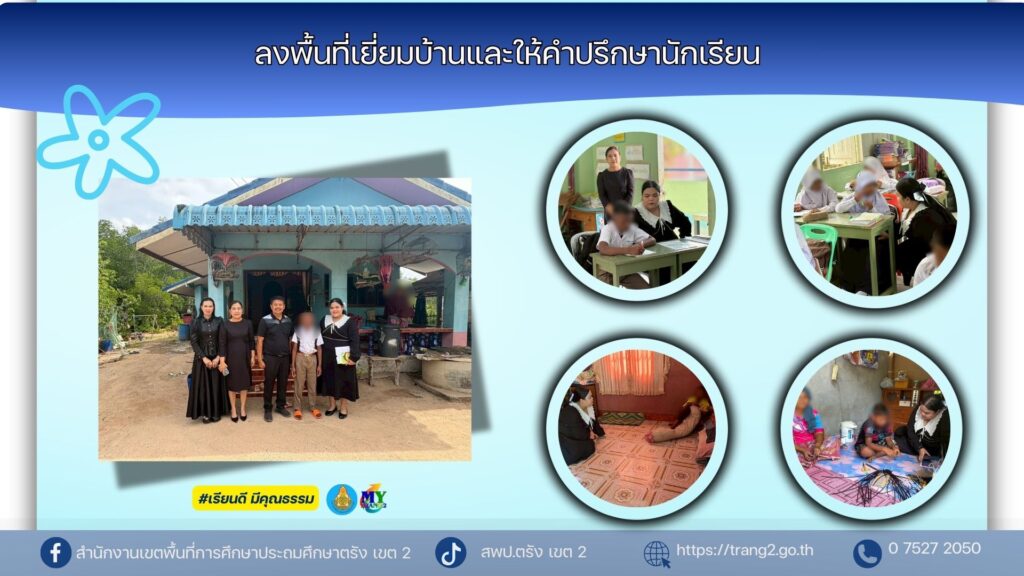 เมื่อวันที่ 19 กุมภาพันธ์ 2569 นางสาวปัญจศีล ภูสงัด ผอ.สพป.ตรัง เขต 2 ได้มอบหมายให้นางสาวพัชรพร ช่วง นักจิตวิทยาโรงเรียนประจำ สพป.ตรัง เขต 2 พร้อมนางสุดใจ ฉูมิ นักวิชาการศึกษาชำนาญการ และนางสาวศุภิสรา ศรีนวลปาน เจ้าพนักงานธุรการปฏิบัติงาน ลงพื้นที่เยี่ยมบ้านและให้คำปรึกษานักเรียน ณ บ้านพักของนักเรียนในพื้นที่อำเภอสิเกา จำนวน 2 ราย และสังเกตพฤติกรรมที่โรงเรียนจำนวน 2 ราย เพื่อรับทราบข้อเท็จจริงเกี่ยวกับสภาพความเป็นอยู่ ปัญหา อุปสรรค ตลอดจนปัจจัยแวดล้อมที่ส่งผลต่อพฤติกรรมและการมาเรียนของนักเรียน