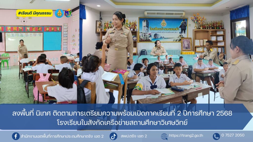 วันที่ 3 พฤศจิกายน 2568 นางสุริยา เครือรัตน์ ผอ.สพป.ตรัง เขต 2 มอบหมายให้นางอัมพิกา อักษรสว่าง รอง ผอ.สพป.ตรัง และนางสาวภิรมย์ ลักษณะ นักวิชาคอมพิวเตอร์ ชำนาญการปฏิบัติหน้าที่ผู้อำนวยการกลุ่มส่งเสริมการศึกษาทางไกลเทคโนโลยีสารสนเทศและการสื่อสาร นางสาวลลิตา อุดรพันธ์ ศึกษานิเทศก์ ลงพื้นที่ นิเทศ ติดตามการเตรียมความพร้อมเปิดภาคเรียนที่ 2 ปีการศึกษา 2568 โรงเรียนในสังกัดเครือข่ายสถานศึกษาวิเศษวิทย์ ได้แก่ โรงเรียนบ้านคลองโตน โรงเรียนวัดเขาวิเศษ โรงเรียนบ้านหน้าเขา โรงเรียนบ้านหลังเขา โรงเรียนบ้านหนองคล้า