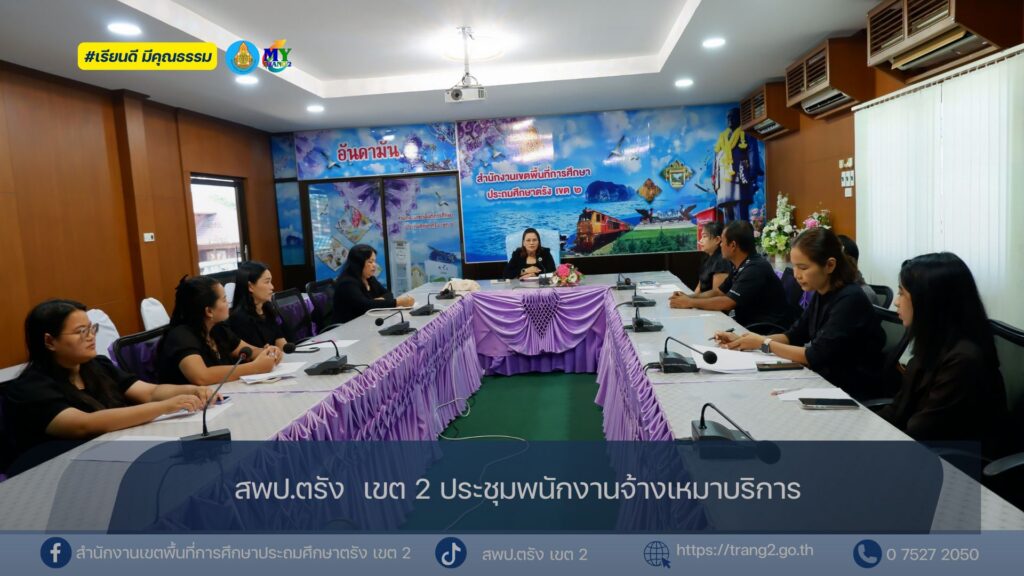 วันที่ 28 ตุลาคม 2568 นางสุริยา เครือรัตน์ ผอ.สพป.ตรัง เขต 2 เป็นประธานการประชุมพนักงานจ้างเหมาบริการของ สพป.ตรัง เขต 2 โดยมีนางอัมพิกา อักษรสว่าง รอง ผอ.สพป.ตรัง เขต 2 และเจ้าหน้าที่ที่เกี่ยวข้อง เข้าร่วม เพื่อแจ้งแนวทางการดำเนินงานของ สพป.ตรัง เขต 2 ประจำปี 2569 ณ ห้องประชุมอันดามัน 4 สพป.ตรัง เขต 2