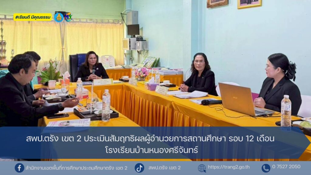 เมื่อวันที่ 12 พฤศจิกายน 2568 นางสุริยา เครือรัตน์ ผู้อำนวยการสำนักงานเขตพื้นที่การศึกษาประถมศึกษาประถมศึกษาตรัง เขต 2 /ประธานคณะกรรมการประเมินสัมฤทธิผลการปฏิบัติงานในหน้าที่เพื่อพัฒนาการศึกษาตำแหน่งผู้อำนวยการสถานศึกษา พร้อมด้วยกรรมการ ได้ลงพื้นที่ดำเนินการประเมินผู้อำนวยการสถานศึกษาในระยะ 1 ปี ครั้งที่ 2 (รอบ 12 เดือน) จำนวน 1 ราย ได้แก่ นางสาววิชุตา ผลิผล ผู้อำนวยการโรงเรียนบ้านหนองศรีจันทร์