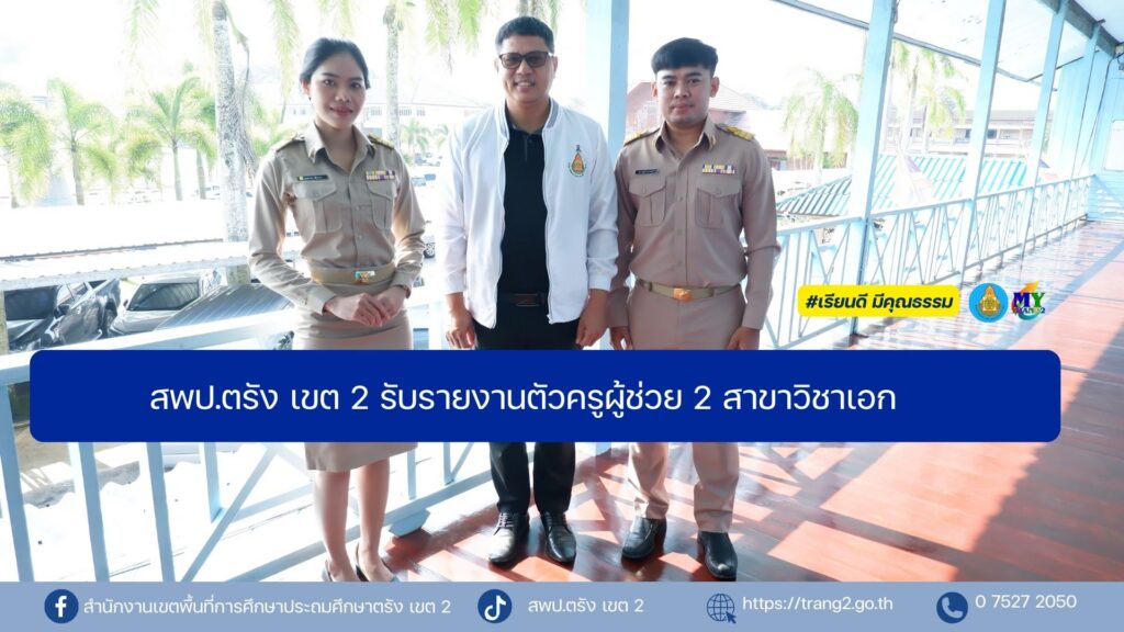 สพป.ตรัง เขต 2 รับรายงานตัวครูผู้ช่วย 2 สาขาวิชาเอก Leave a Comment / By bunrada kadet / 04/12/2025 Share จำนวนผู้ชมโพสต์ : 44 วันที่ 4 ธันวาคม 2568 นางสุริยา เครือรัตน์ ผอ.สพป.ตรัง เขต 2 มอบหมายให้นายปรีชา หมีนคลาน รอง ผอ.สพป.ตรัง เขต 2 รับรายงานตัวครูผู้ช่วย รอบที่ 9 จำนวน 2 อัตรา 2 สาขาวิชาเอก ได้แก่วิชาเอกภาษาไทย และวิชาเอกพลศึกษา เพื่อร่วมพัฒนาคุณภาพผู้เรียนต่อไป