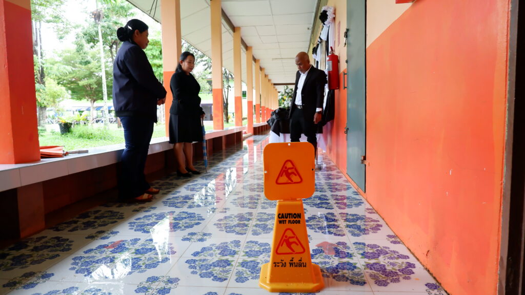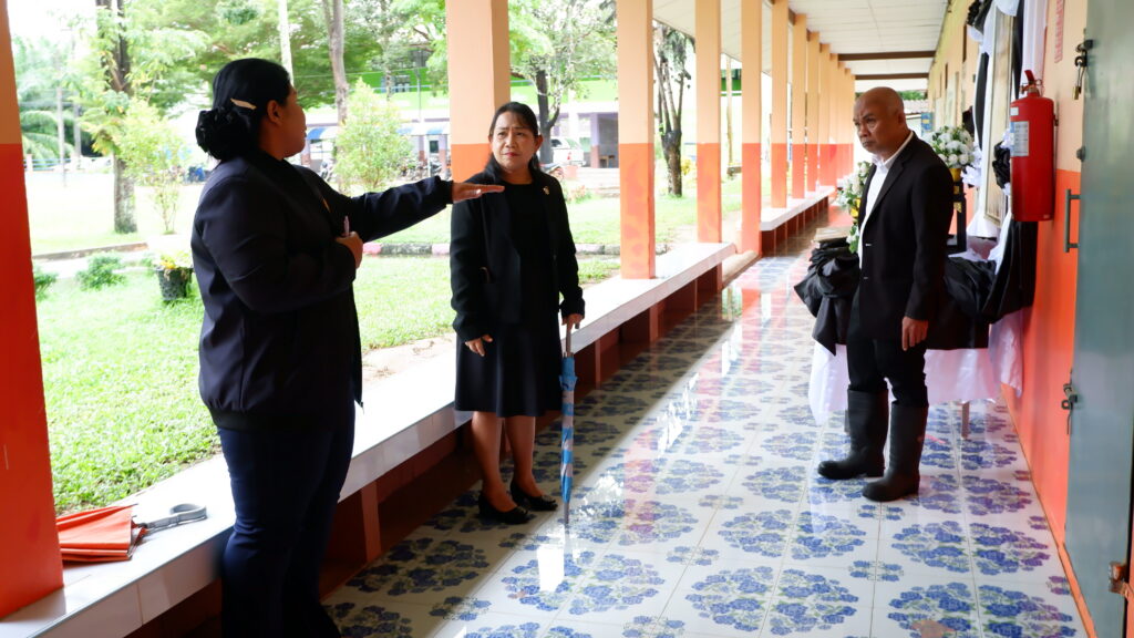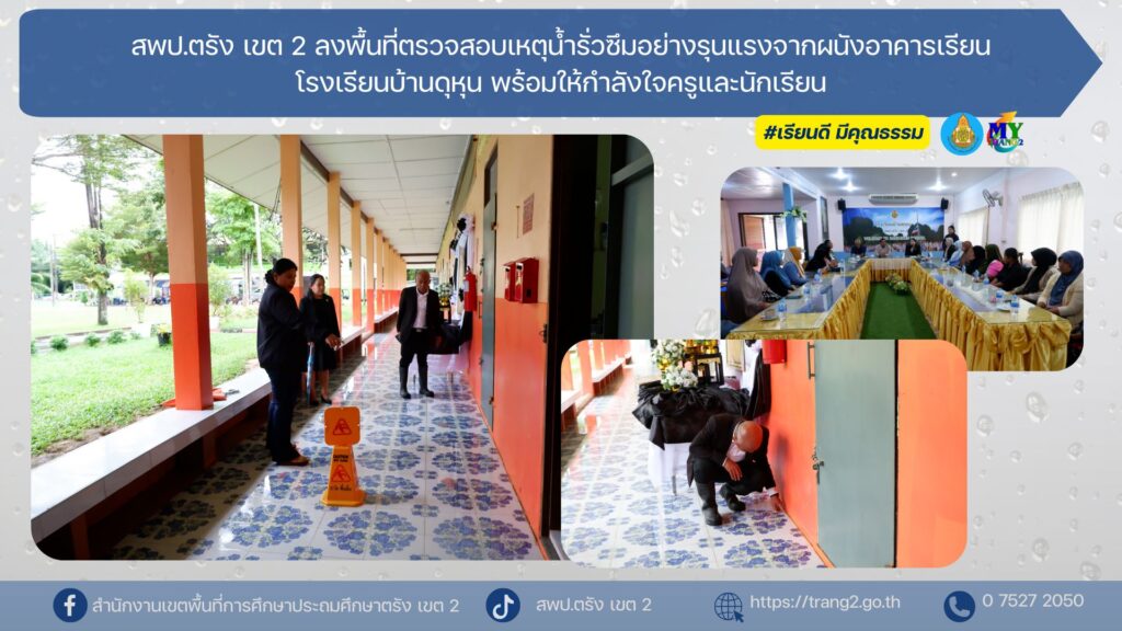 วันที่ 25 พฤศจิกายน 2568 นางสุริยา เครือรัตน์ ผอ.สพป.ตรัง เขต 2 มอบหมายให้นางอัมพิกา อักษรสว่าง รอง ผอ.สพป.ตรัง เขต 2 พร้อมด้วยนายชัยยุทธ สมบูรณ์ ผอ.กลุ่มอำนวยการ ลงพื้นที่โรงเรียนบ้านดุหุน อำเภอสิเกา จังหวัดตรัง หลังจากได้รับแจ้งเหตุจากนางรชฎนันท์ พระคง ผอ.โรงเรียนบ้านดุหุน ว่ามีน้ำรั่วซึมอย่างรุนแรงออกมาจากผนังด้านนอกอาคารเรียน ทำให้น้ำเจิ่งนองบนพื้นอาคารเรียน