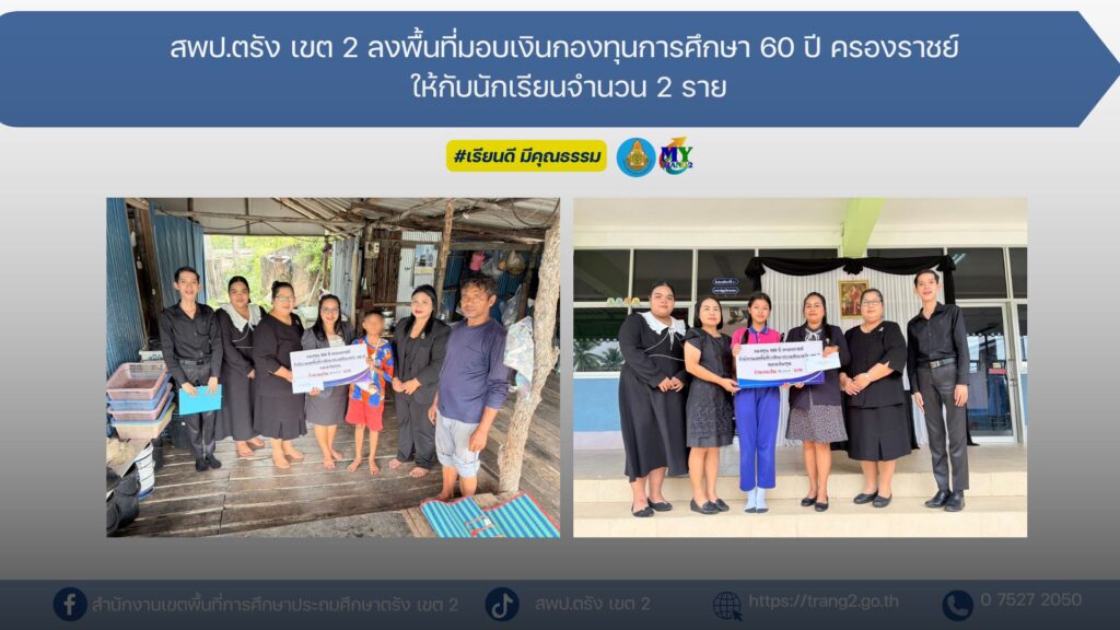 นอกจากนั้นคณะ สพป.ตรัง เขต 2 ได้ลงพื้นที่ร่วมกับนางทิพวรรณ จันดี ผู้อำนวยการโรงเรียนห้วยยอด (กลึงวิทยาคาร) /ผู้ประสานงานอำเภอห้วยยอด และนางสาววัชรี เลิศสกุลจินดา ผู้อำนวยการโรงเรียนวัดบางดี เยี่ยมให้กำลังใจ พร้อมมอบทุนการศึกษา 60 ครองราชย์ ให้กับน้องนักเรียนชั้นประถมศึกษาปีที่ 6 โรงเรียนวัดบางดี ซึ่งประสบอุบัติเหตุรถชนกัน ได้รับบาดเจ็บเล็กน้อย ขณะนี้กลับมาเรียนหนังสือได้ปกติแล้ว