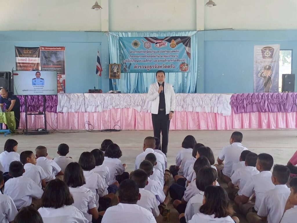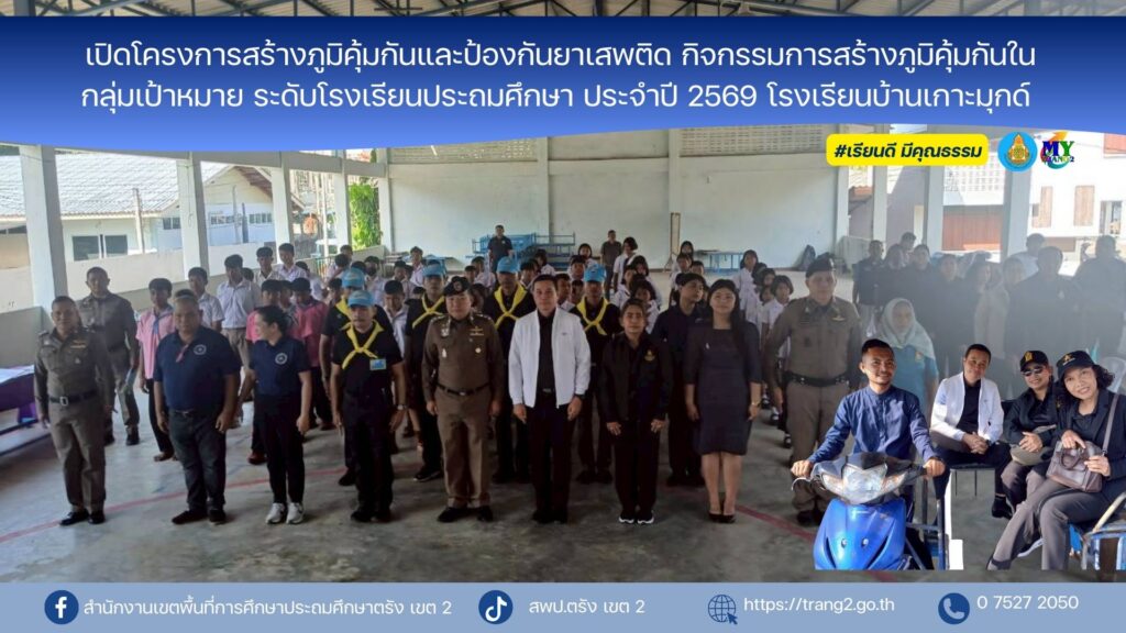 วันที่ 22 มกราคม 2569 นางสาวปัญจศีล ภูสงัด ผอ.สพป.ตรัง เขต 2 ได้มอบหมายให้นายภูวดล เม่งช่วย รอง ผอ.สพป.ตรัง เขต 2 เป็นประธานในพิธีเปิดโครงการสร้างภูมิคุ้มกันและป้องกันยาเสพติด กิจกรรมการสร้างภูมิคุ้มกันในกลุ่มเป้าหมาย ระดับโรงเรียนประถมศึกษา ประจำปี 2569 ของตำรวจภูธรจังหวัดตรัง เพื่อให้ความรู้เกี่ยวกับการป้องกันและแก้ไขปัญหายาเสพติด และกิจกรรมสัมพันธ์เพื่อสร้างความสามัคคี การเสียสละและการมีส่วนร่วมแก่ผู้เข้าร่วมโครงการฯ ให้แก่นักเรียน ณ โรงเรียนบ้านเกาะมุกด์ ตำบลเกาะลิบง อำเภอกันตัง จังหวัดตรัง โดยมีนางปิ่นมณี ชัยวงศ์ ผอ.โรงเรียนบ้านบางสัก/ประธานเครือข่ายสถานศึกษาอันดามันนางสาวกิ่งกาญจน์ ชูพูล รองผอ.โรงเรียนบ้านเกาะมุกด์ รักษาการในตำแหน่ง ผอ.โรงเรียนบ้านเกาะมุกด์ คณะครูโรงเรียนบ้านเกาะมุกด์ ศึกษานิเทศก์ และบุคลากรกลุ่มส่งเสริมการจัดการศึกษา สพป.ตรัง เขต 2 ร่วมลงพื้นที่ด้วย