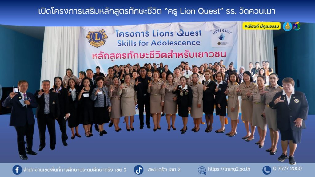 วันที่ 19 มกราคม 2569 นางสาวปัญจศีล ภูสงัด ผอ.สพป.ตรัง เขต 2 เป็นประธานในพิธีเปิดโครงการเสริมหลักสูตรทักษะชีวิต “ครู Lion Quest” ณ โรงเรียนวัดควนเมา อำเภอรัษฎา จังหวัดตรัง โดยมีนางจิราภรณ์ บัวเพ็ชร ผอ.โรงเรียนวัดควนเมา รอง ผอ.โรงเรียนวัดควนเมา คณะครู ผู้บริหารสถานศึกษาใกล้เคียง และครูจาก 20 โรงเรียน จำนวน 70 คน พร้อมด้วยนายกสโมสรไลออนส์ตรัง และคณะ เข้าร่วม