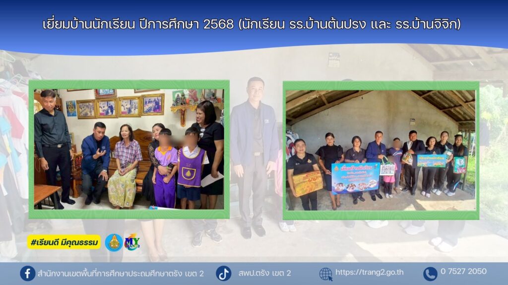 วันที่ 28 มกราคม 2569 นางสาวปัญจศีล ภูสงัด ผอ.สพป.ตรัง เขต 2  ได้มอบหมายให้นายภูวดล เม่งช่วย รอง ผอ.สพป.ตรัง เขต 2 พร้อมด้วยบุคลากรกลุ่มส่งเสริมการจัดการศึกษา สพป.ตรัง เขต 2 ลงพื้นที่เยี่ยมบ้าน พร้อมมอบสิ่งของเครื่องอุปโภค บริโภค ให้แก่นักเรียนกลุ่มเสี่ยงหรือมีปัญหาด้านการเรียนในพื้นที่อำเภอวังวิเศษ จำนวน 2 ราย เพื่อเป็นการช่วยเหลือนักเรียนกลุ่มดังกล่าวไม่ให้หลุดออกจากระบบการศึกษา และลดอัตราการออกกลางคัน ดังนี้