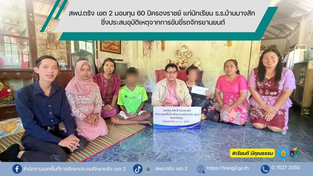 สพป.ตรัง เขต 2 มอบทุน 60 ปีครองราชย์ แก่นักเรียน ร.ร.บ้านบางสัก ซึ่งประสบอุบัติเหตุจากการขับขี่รถจักรยานยนต์ ข่าวกิจกรรม สพป.ตรัง เขต 2, ข่าวจัดซื้อจัดจ้าง / bunrada kadet นางสุริยา เครือรัตน์ ผอ.สพป.ตรัง เขต 2 มอบหมายให้ นายปรีชา หมีนคลาน รอง ผอ.สพป.ตรัง เขต 2 นางสาวปิยะวรรณ มากหอม นักวิชาการศึกษาชำนาญการ นายนรินทิพย์ หลงสะ เจ้าพนักงานธุรการปฏิบัติงาน นางปิ่นมณี ชัยวงศ์ ผู้อำนวยการโรงเรียนบ้านบางสัก คณะครูโรงเรียนบ้านบางสัก ลงพื้นที่เยี่ยมให้กำลังใจผู้ปกครองและนักเรียน พร้อมทั้งมอบทุน 60 ปีครองราชย์ จำนวน 3,000 บาท แก่นักเรียนชั้นประถมศึกษาปีที่ 6 ซึ่งประสบอุบัติเหตุจากการขับขี่รถจักรยานยนต์ชนสุนัข ขณะนี้นักเรียนมีอาการดีขึ้น และพักรักษาตัว ณ บ้านพักอาศัย เมื่อวันที่ 7 ตุลาคม 2568 1.1123 สพป.ตรัง เขต 2 มอบทุน 60 ปีครองราชย์ แก่นักเรียน ร.ร.บ้านบางสัก ซึ่งประสบอุบัติเหตุจากการขับขี่รถจักรยานยนต์ Read More »